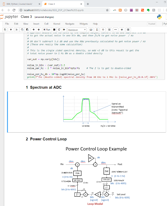 This long-running course includes Jupyter Notebooks which incorporates graphics together with Python simulation code to provide a “take-it-with-you” interactive user experience. No knowledge of Python is required as the notebooks will provide a basic framework for proceeding with further signal processing development using those tools for those that have interest in doing so.